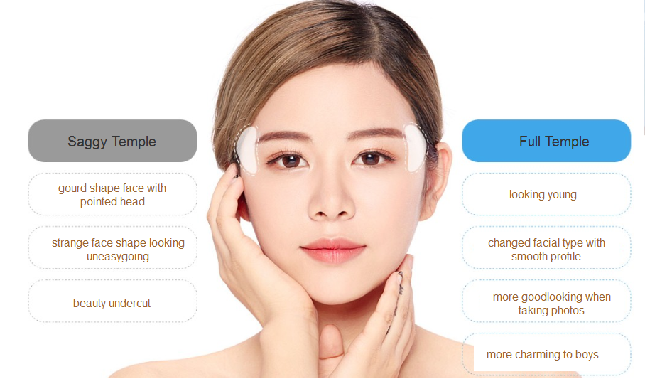 Saggy temple makes whole face type look strange and greatly undercuts your beauty. Hyaluronan injection and fat transplantation can improve whole facial profile by filling the temple and make it fuller.